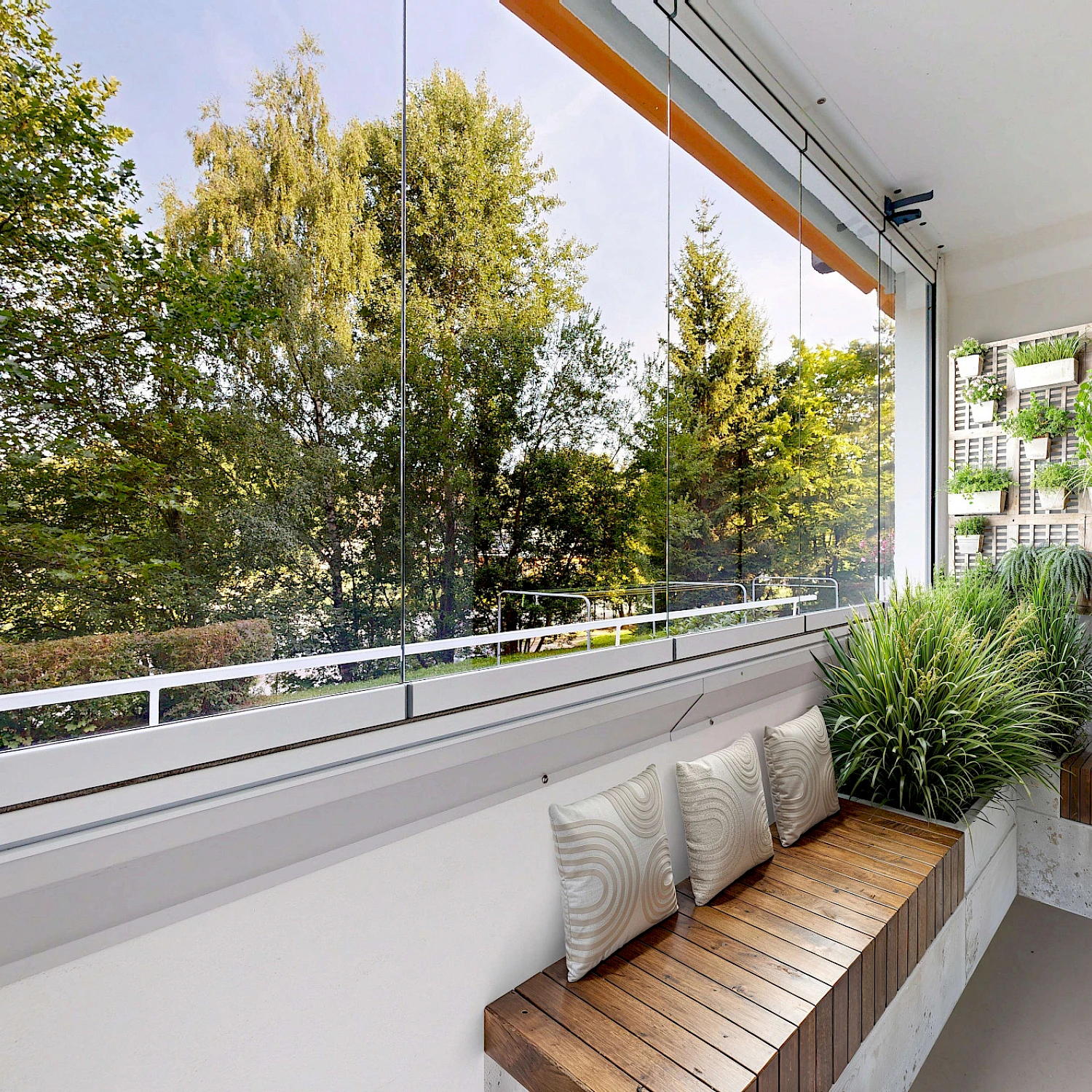 Weiteres praktisches Highlight ist die vorhandene Balkonverglasung, die an kalten und regnerischen Tagen als Wetterschutz dient, an warmen, sonnigen Tagen aber auch vollständig geöffnet werden kann.