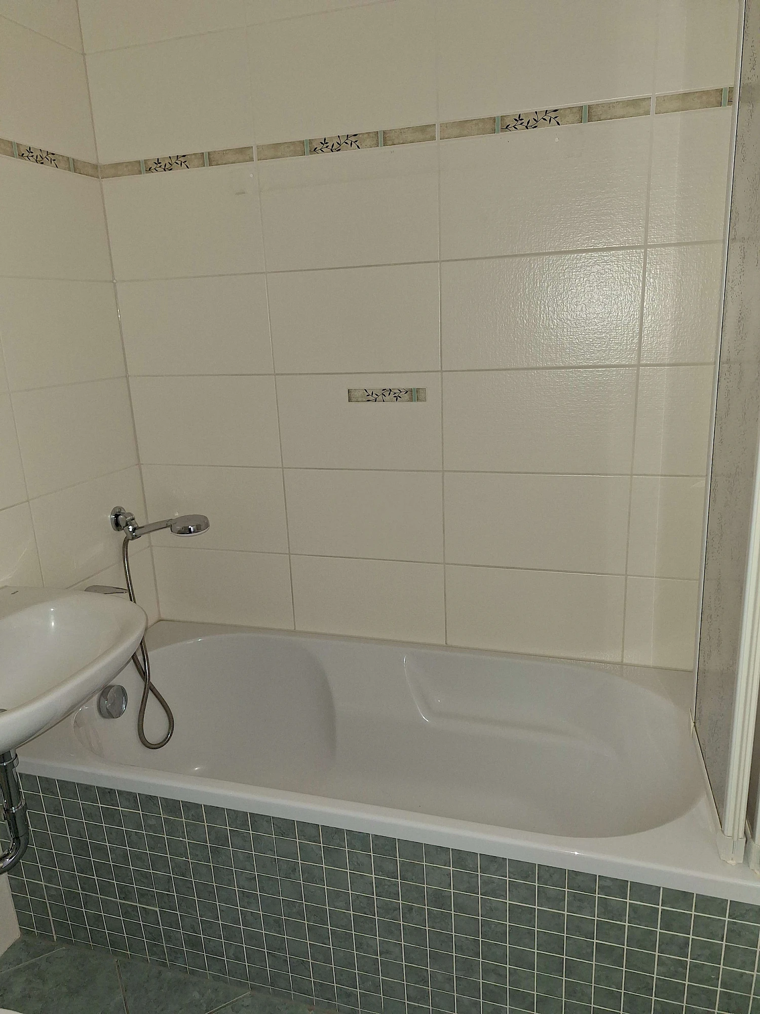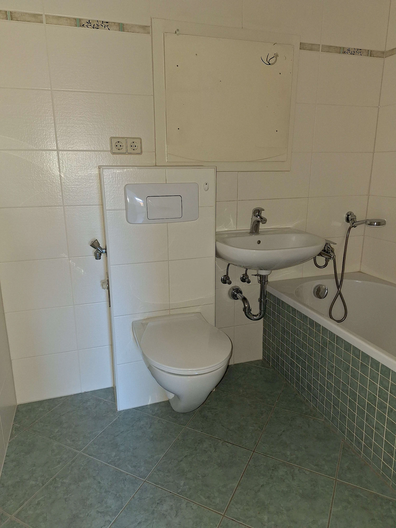 Das Badezimmer ist bereits raumhoch gefliest und mit einer Badewanne ausgestattet.