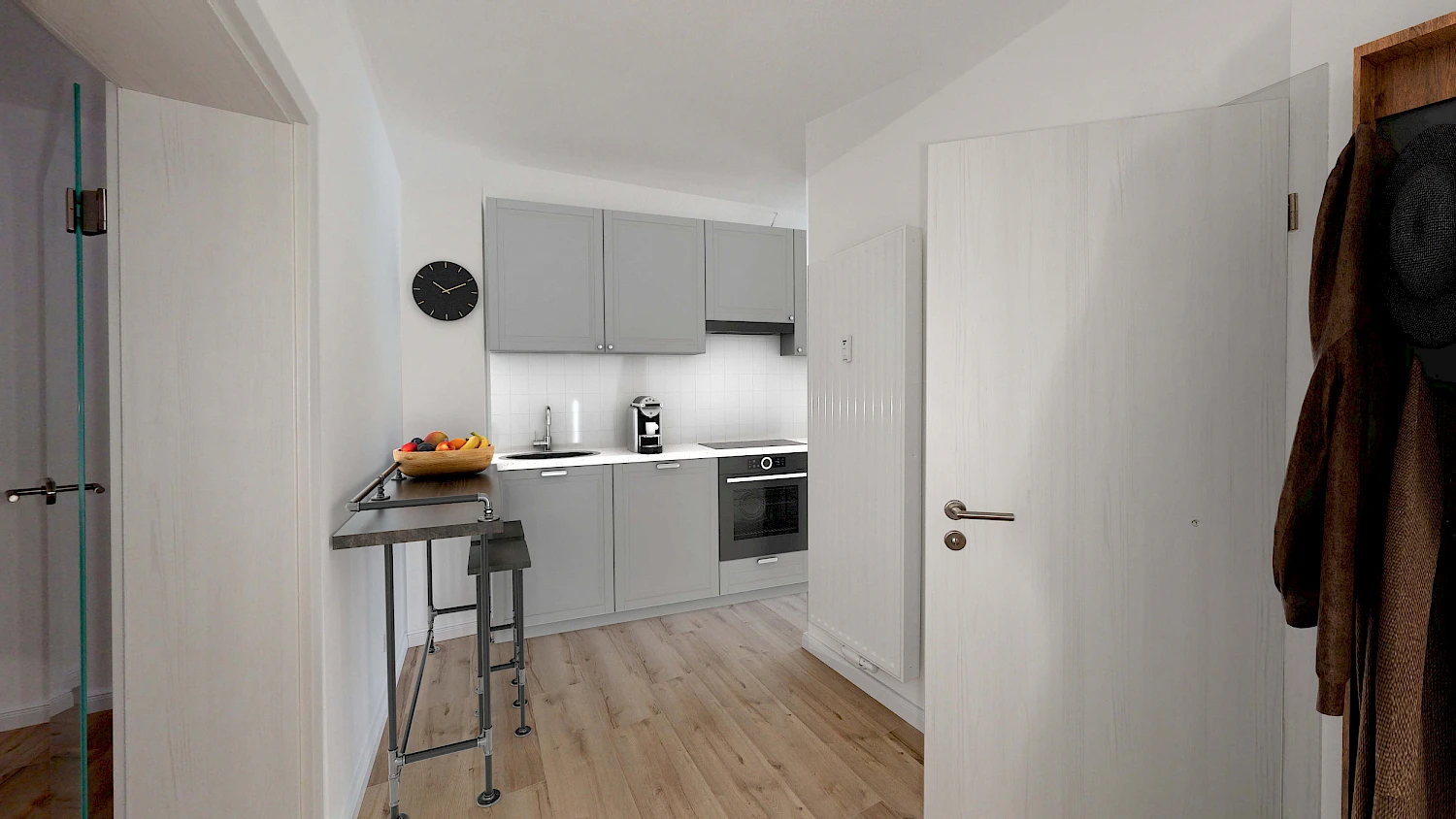 Man betritt die Wohnung über den großen Eingangsbereich, welcher zur Küche offen gestaltet ist. Der Flur bietet Stellfläche für eine Garderobe sowie Schuhschränke. Die offene Küche gewährt Zugang zum Balkon, welcher Ost-Ausrichtung hat. Der Wohn-/Schlafbereich befindet sich straßenseitig und hat Westausrichtung. Des Weiteren verfügt die Wohnung über ein stilvolles Tageslichtbad mit Flachdusche und Waschmaschinenstellplatz.
